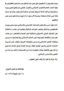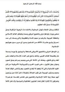 إننا بكل أسى وألم نعلن تضامننا الإنساني والإسلامي مع مسلمي بورما المضطهدين، ونستنكر ونشجب الجرائم المرتبكة بحقهم إلى جانب استنكارنا على التواطؤ الدولي الأمريكي واستنكارنا على الصمت والتجاهل من جانب المؤسسات والأنظمة المحسوبة على العالم الإسلامي وفي مقدمتها ما يسمى بمنظمة التعاون الإسلامي وما يسمى بالجامعة العربية، ونؤكد على ضرورة التحرك العاجل والسعي الحثيث لوقف جرائم الإبادة بحق أولئك المسلمين إن كان بقي للأنظمة وتلك المنظمات ذرة من الإنسانية أو أقل من ذرة من الشعور والإحساس الإسلامي.