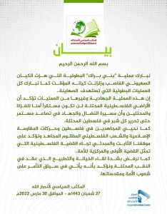 | أخبار محلية | 27 شعبان 1443هـ الثقافة القرآنية: بارك المكتب السياسي لأنصار الله عملية “بني براك” البطولية التي هزت الكيان الصهيوني الغاصب وزلزلت كيانه المؤقت كما بارك كل العمليات البطولية التي تستهدف الصهاينة.