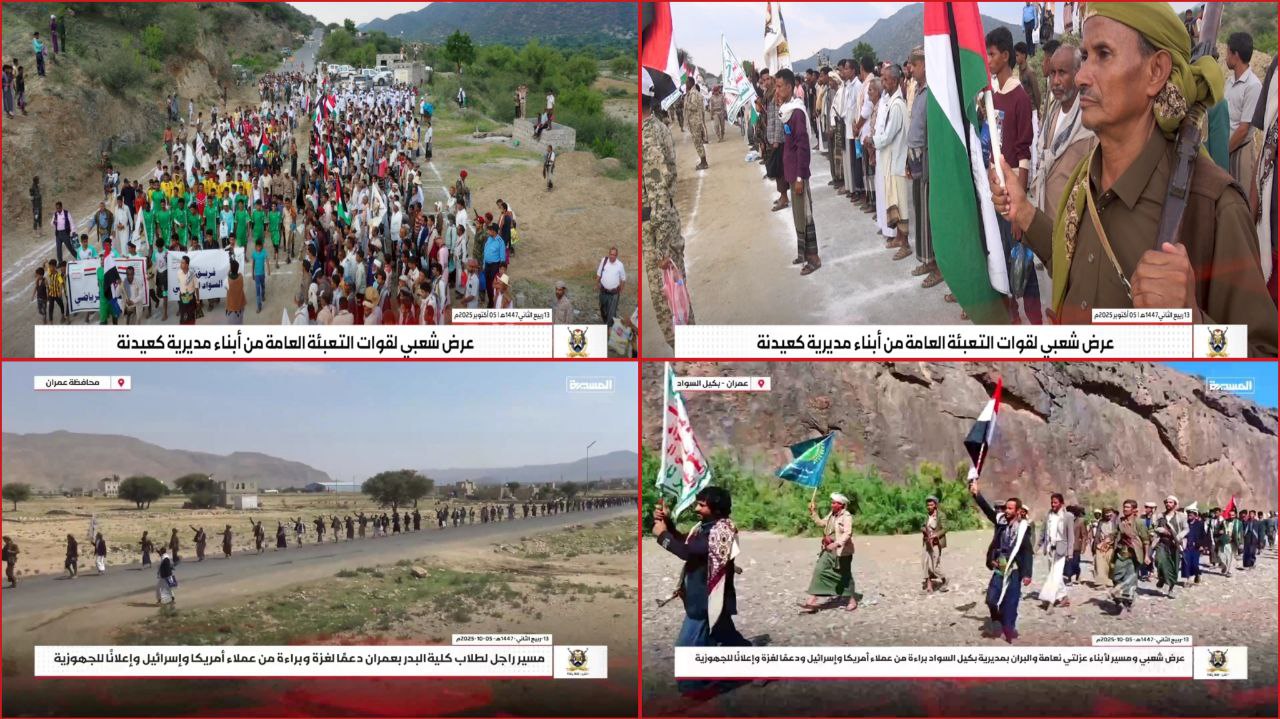 | أخبار يمنية | 14 ربيع الثاني 1447هـ الثقافة القرآنية: شهدت محافظتا عمران وحجة اليوم سلسلة فعاليات شعبية وعروض راجلة، جسّدت روح الجهوزية لخوض كل الخيارات دعماً للشعب الفلسطيني ومواجهة المؤامرات الصهيوأمريكية.