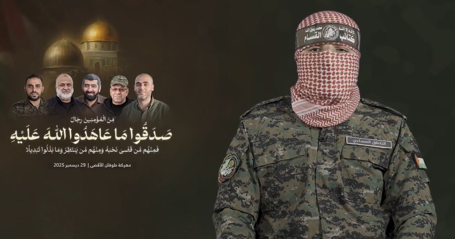 | أخبار فلسطين | 9 رجب 1447هـ الثقافة القرآنية: أعلنت كتائب الشهيد عز الدين القسام؛ الجناح العسكري لحركة المقاومة الإسلامية “حماس”، مساء اليوم الإثنين، استشهاد ثلة من قياداتها ورموزها: “أبو عبيدة”، محمد السنوار، محمد شبانة، رائد سعد، و”أبو عمر السوري” على طريق القدس.