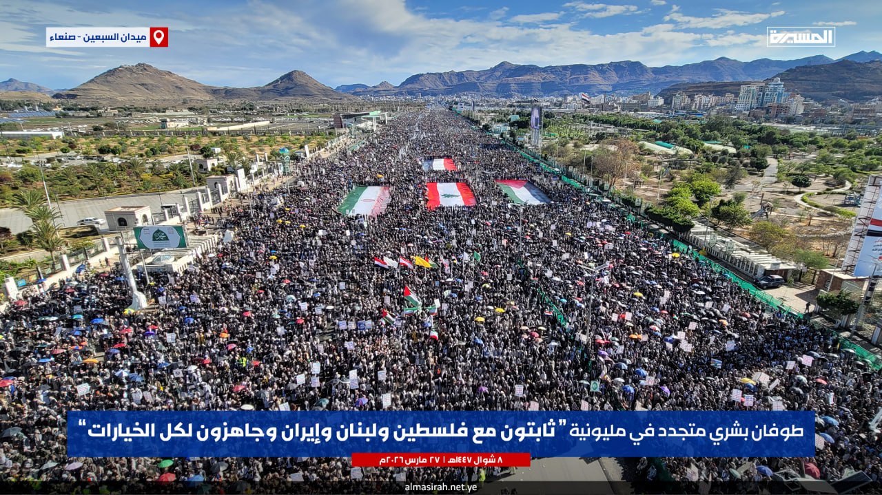 | أخبار يمنية | 8 شوال 1447هـ الثقافة القرآنية: احتضن ميدان السبعين بالعاصمة صنعاء اليوم، مسيرة مليونية تحت شعار “ثابتون مع فلسطين ولبنان وإيران.. وجاهزون لكل الخيارات” وإحياء لليوم الوطني للصمود.