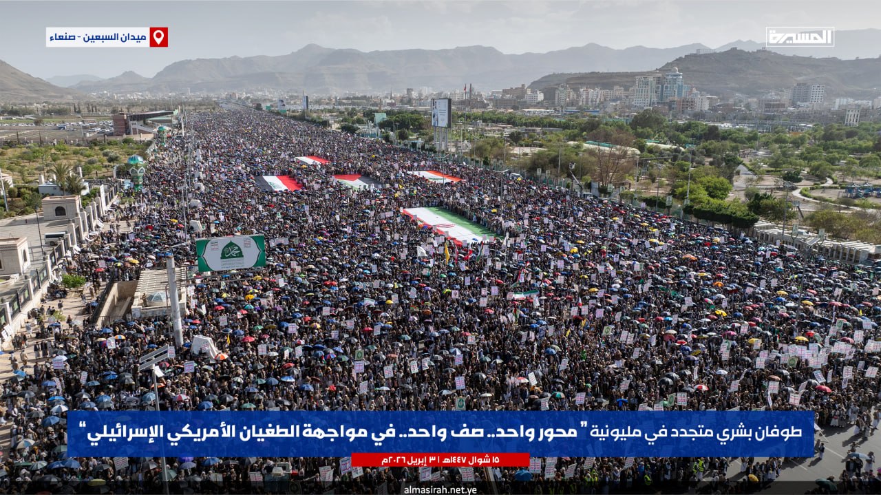 | أخبار يمنية | 15 شوال 1447هـ الثقافة القرآنية: توافد الملايين إلى ميدان السبعين في العاصمة صنعاء، اليوم الجمعة، في مسيرة جماهيرية حاشدة تضامنًا مع إيران ولبنان وفلسطين والعراق، وتحت شعار “محور واحد صف واحد في مواجهة الطغيان الأمريكي والإسرائيلي”.